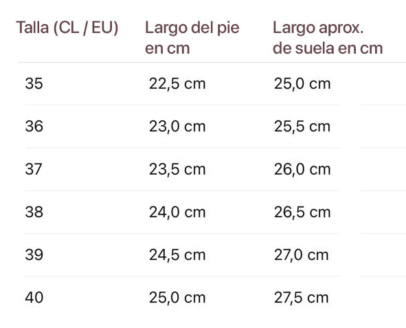 Las medidas corresponden al largo del pie, no de la suela.