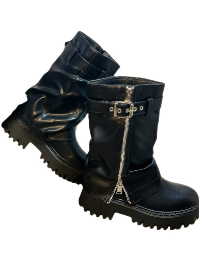 HECHAS DE CUERO VEGANO, SOLAPA NO DESMONTABLE, CIERRE LATERAL, HEBILLA REGULABLE Y CAMBIABLE, PLATAFORMA DE 6 CM, ALTURA DE LA CAÑA 23 CM, PUNTA REDONDEADA, SUELA ANATOMICA.