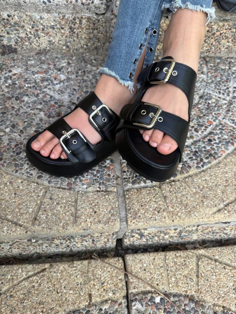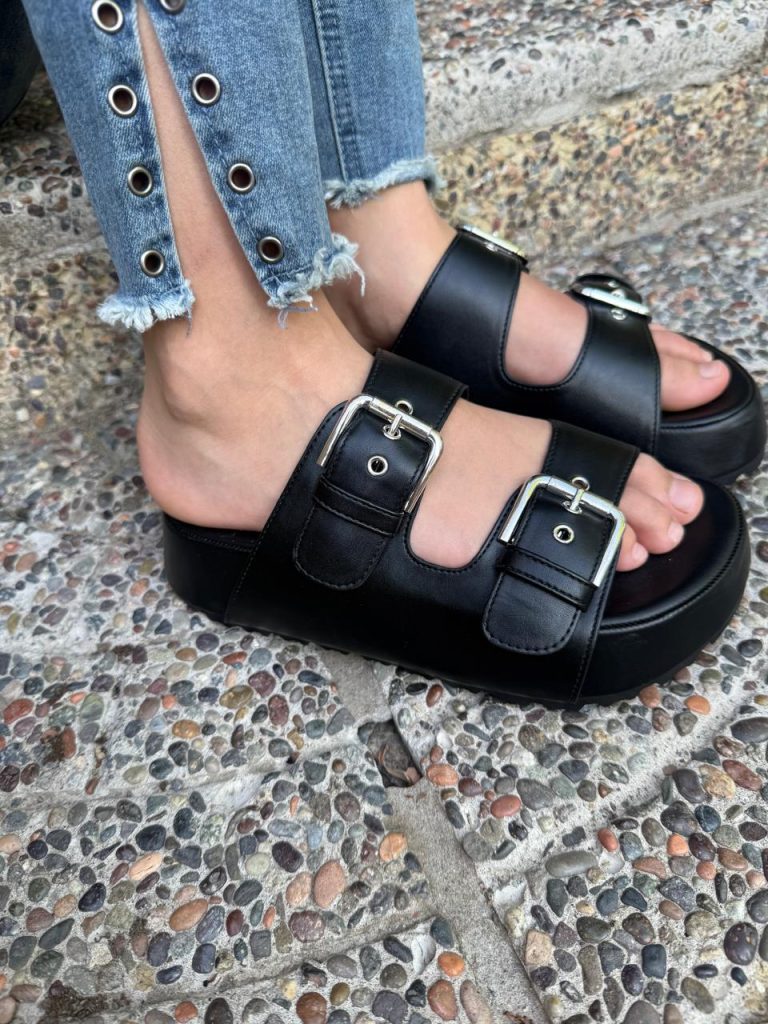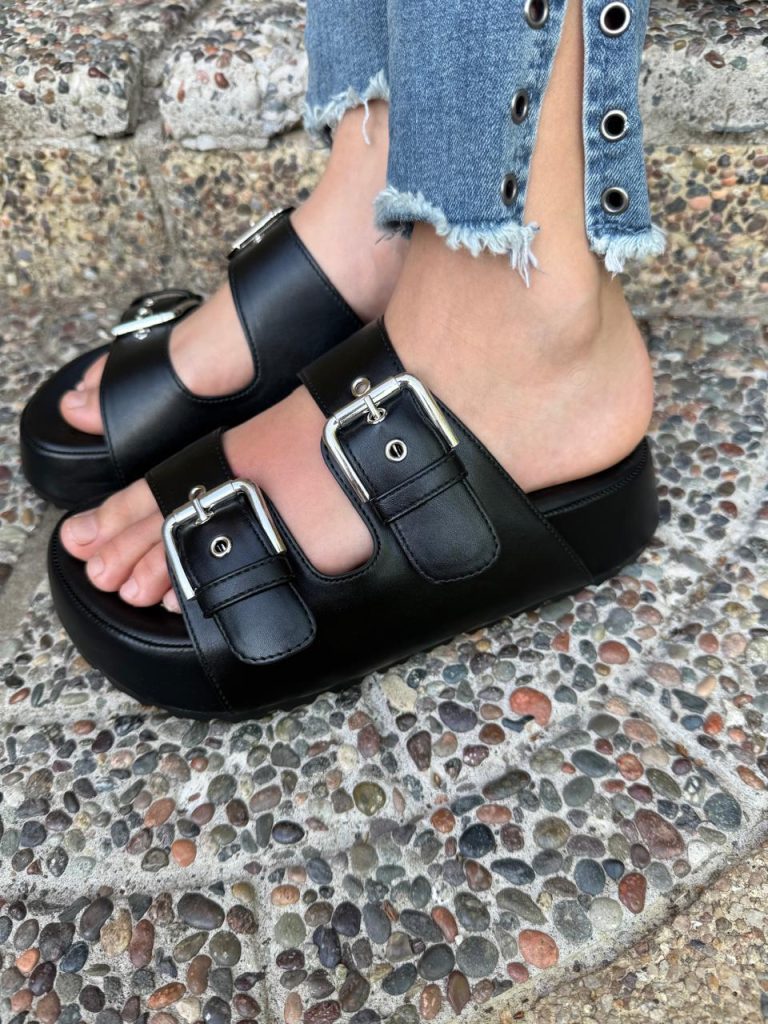 Diseñadas en eco cuero negro, destacan por su doble correa ancha con hebillas metálicas plateadas, un detalle moderno que aporta fuerza y elegancia a cualquier look.